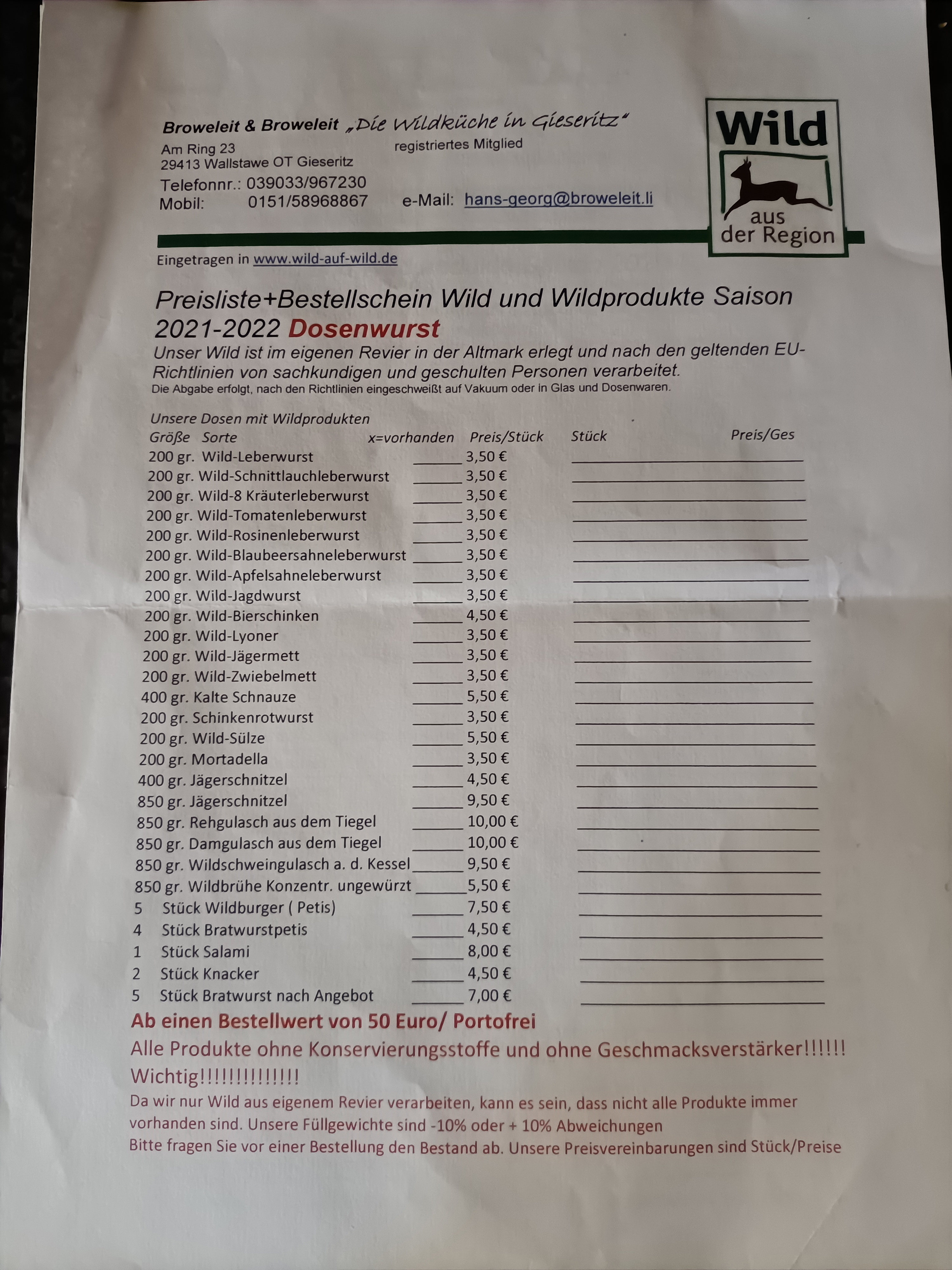 Falls jemand Interesse an Wildwurst hat, ich habe unsere Liste mal als Dateianhang beigefügt. Außerdem ist es möglich, falls mal jemand die Lust auf die richtige Jagd verspürt, diesen auf eine richtige Jagd mitzunehmen.